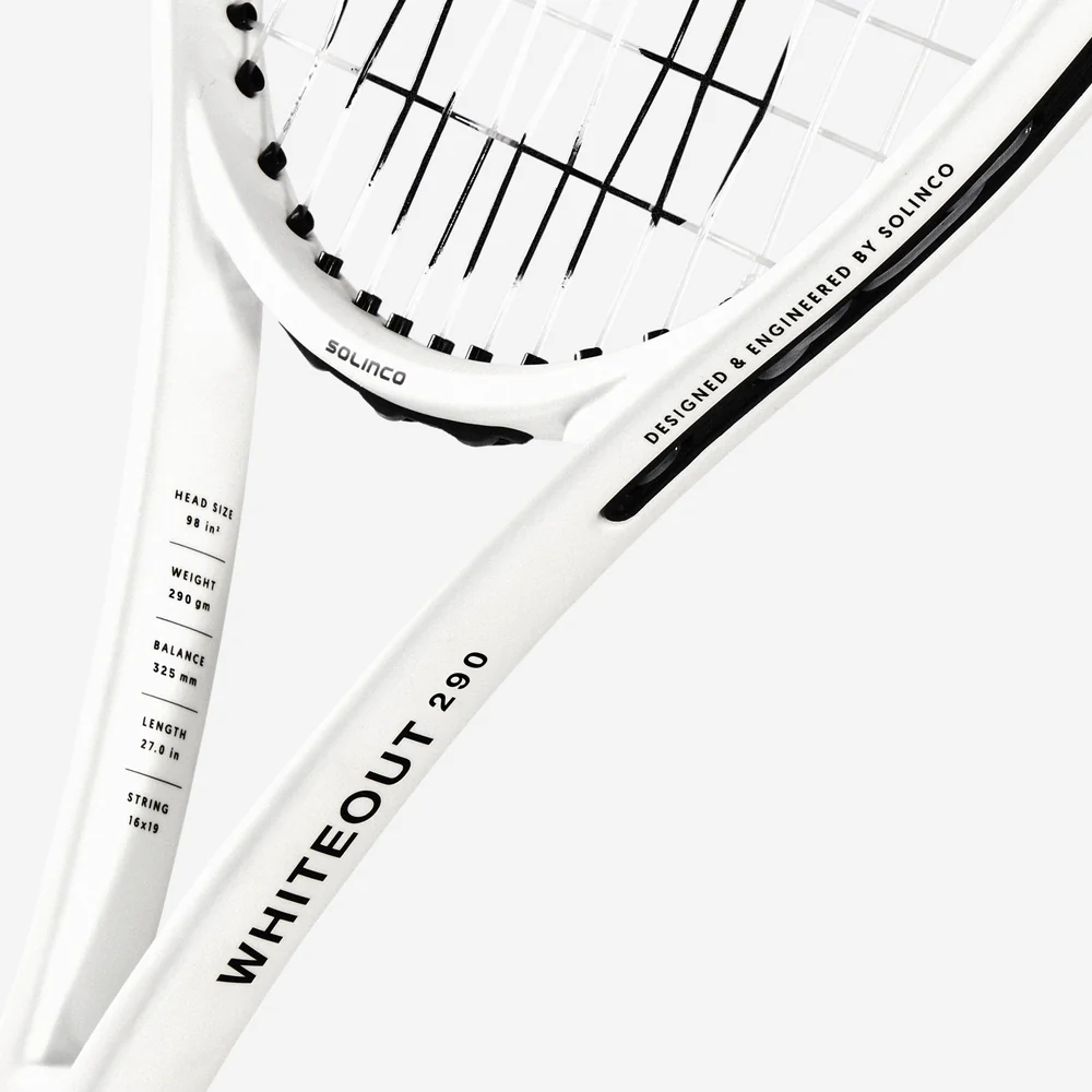 Ракетка изготовлена из высококачественного графита с применением передовых технологий Solinco, обеспечивающих усиленную стабильность и контроль при ударах. Конструкция рамы оптимизирована для снижения вибраций и увеличения sweet spot, что делает игру более предсказуемой и комфортной. Модель обеспечивает эффективную передачу энергии мячу, высокую точность и устойчивость на скорости. Whiteout раскрывает максимальный потенциал игрока при правильной технике и активной игре.